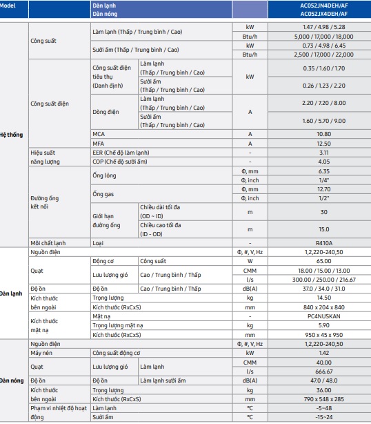 Thông số kỹ thuật Máy lạnh âm trần samsung inverter R410a - 2 chiều lạnh