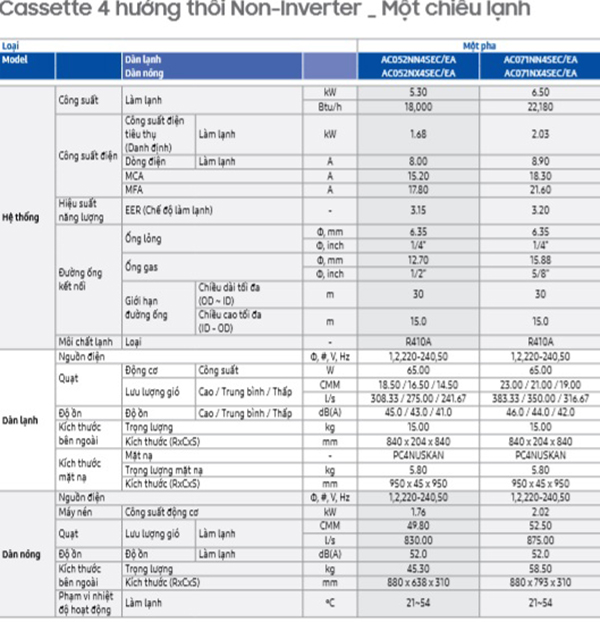 Thông số kỹ thuật Máy lạnh âm trần samsung non inverter R410a - 1 chiều lạnh