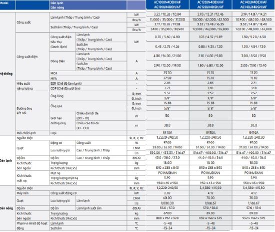 Thông số kỹ thuật Máy lạnh âm trần samsung inverter R410a - 2 chiều lạnh